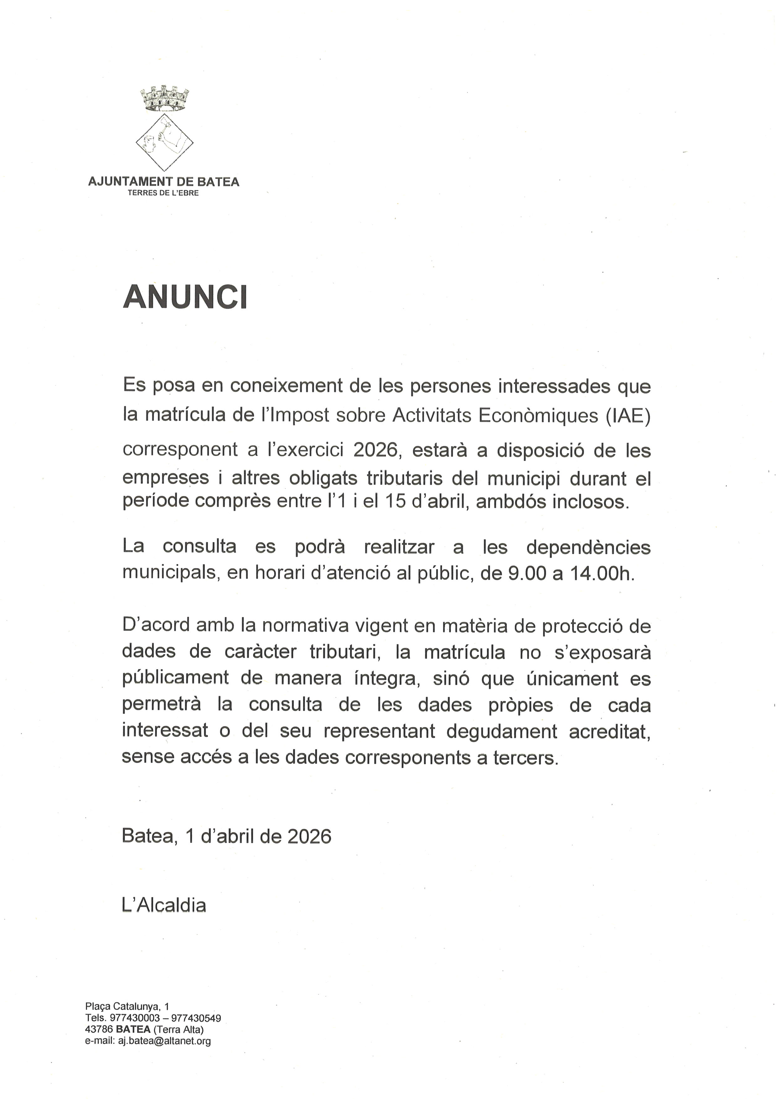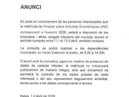 LA MATRÍCULA DE L'IMPOST SOBRE ACTIVITATS ECONÒMIQUES (IAE) 2026, CONSULTA A LES DEPENDÈNCIES MUNICIPALS DEL DIA 1 D'ABRIL AL 15 D'ABRIL.